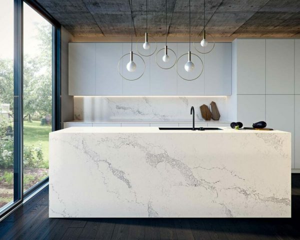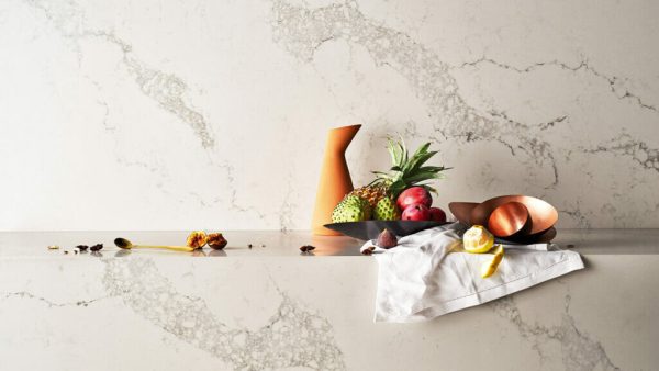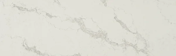 Dove White with Light Grey Veins Quartz Countertop Classic elegance of a feathered dove-white base, contrasted by broad light-grey veins in an elongated clouded movement that is absorbed deep into the surface, like mist.
