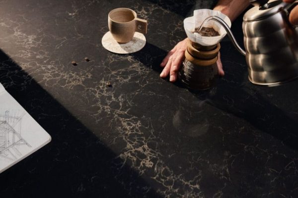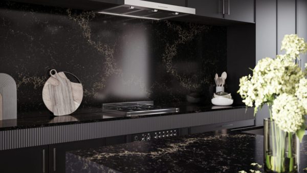 Black with Cream Veins Mineral Countertop. A rich and luxurious ebony base, washed with expanding creamy vanilla veins and exuding a bold personality.