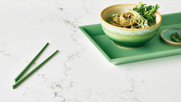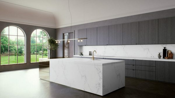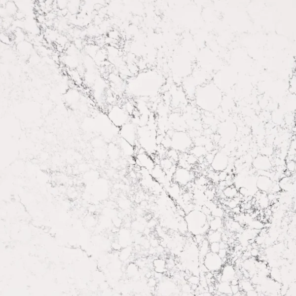 Empira White with Dark Veins Quartz Countertop. A timeless white base of the purest hue, touched by the movement of soft shadows in an interplay of darkness and light.